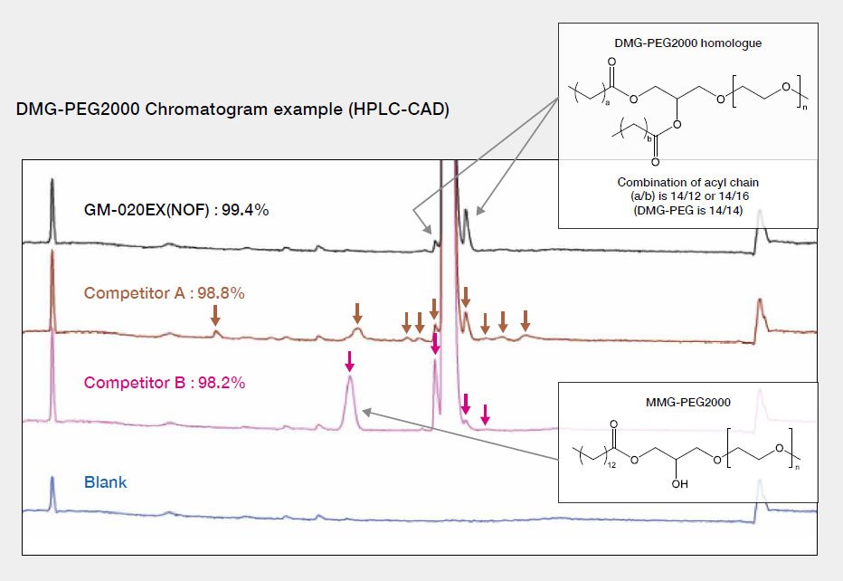 日油株式会社は、LNP用途向けに、様々なPEG分子量とアシル鎖長のジアシルグリセロール型PEG脂質を供給しており、現在では業界最高レベルの高純度PEG脂質を製品化しています。